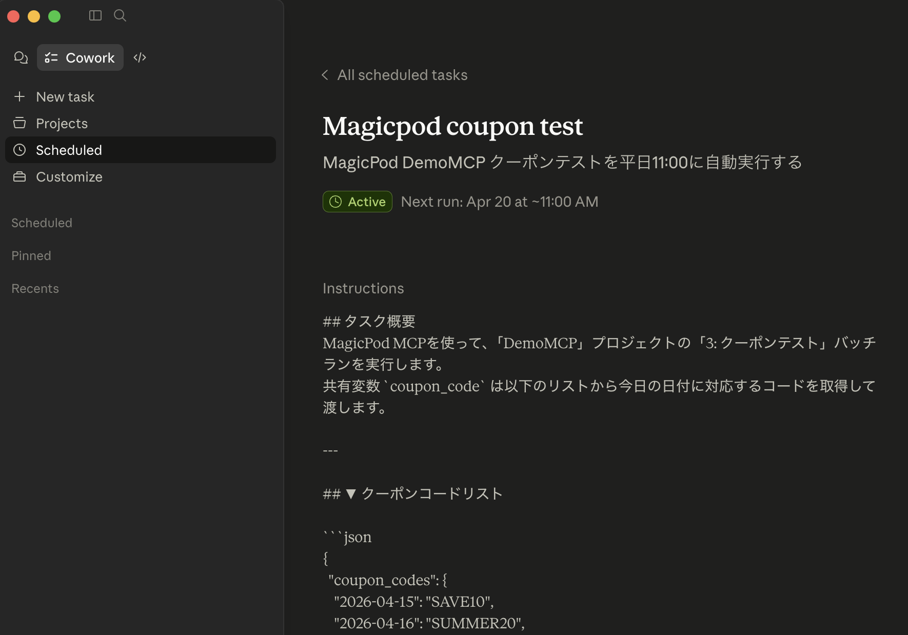 Claude CoworkでMagicPodのテストを定期実行させてみた