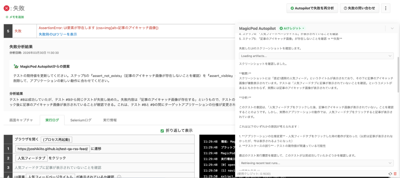 MagicPodの失敗分析機能は、テストが失敗した際にAIがその原因を自動で分析してくれる機能です。