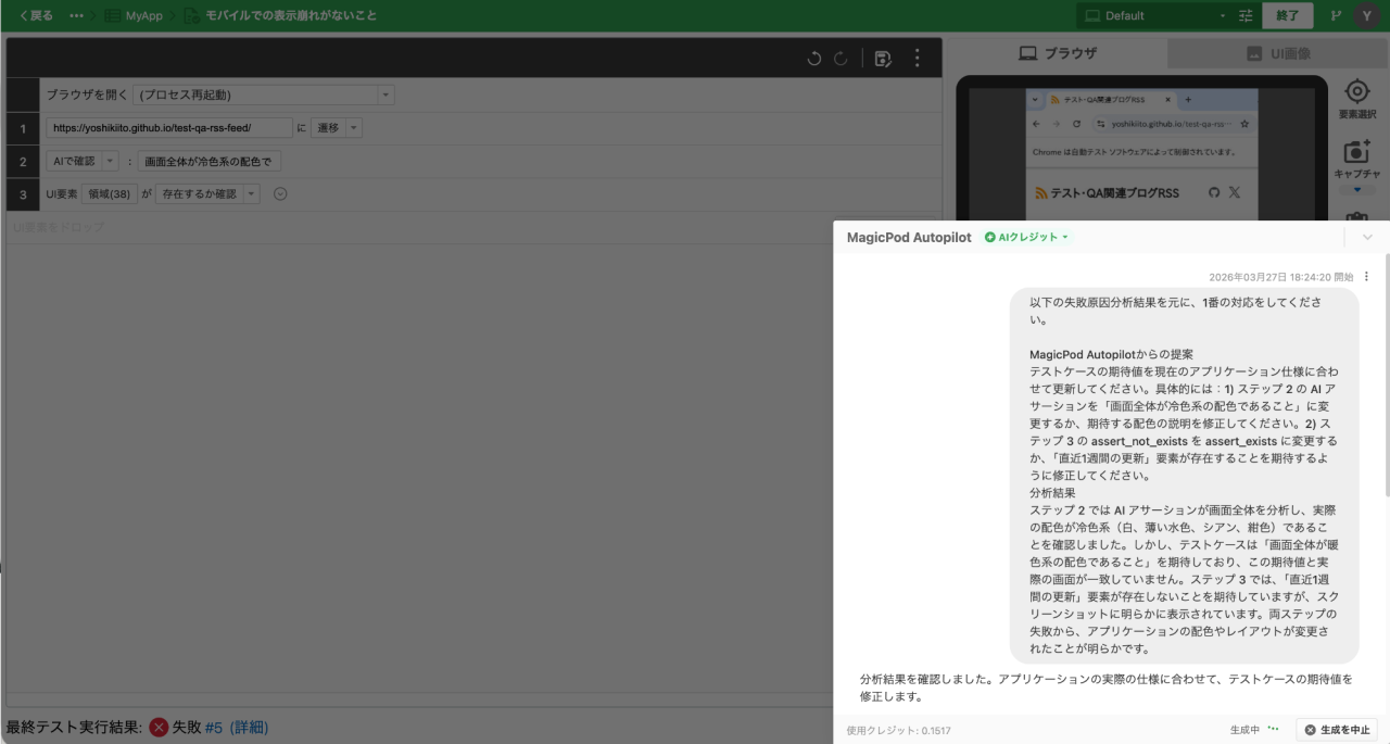 やりかたはシンプルで、失敗分析の結果をコピーして、MagicPod Autopilotに「この内容をもとにテストを修正して」と依頼するだけです。AIが分析した失敗原因と提案をもとにMagicPod Autopilotがテストステップを修正してくれます。テスト自動化の運用では「テストのメンテナンスが大変」という声をよく聞きますが、失敗分析とMagicPod Autopilotを組み合わせることで、このメンテナンスコストを下げる一つの手段になりそうです。