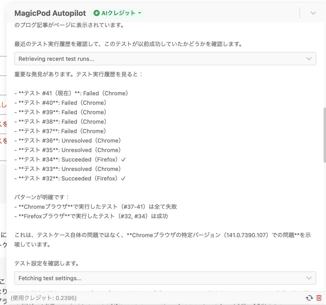 AI機能というと「クレジットがどんどん減っていくのでは」と心配になるかもしれませんが、失敗分析機能のAIクレジット消費量は、使ってみた印象としてかなり控えめです。MagicPod Autopilotを使ってテストを作成・編集するのに比べると、失敗原因の調査にかかるクレジット消費量は少なく見えました。