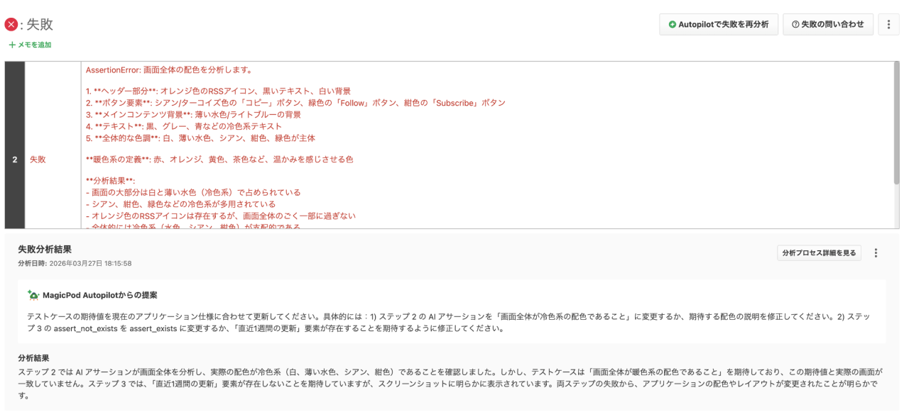 一点補足しておくと、AIで確認コマンドの結果は失敗分析の対象外です。分析されるのはテストステップの実行に伴う失敗であり、すべての失敗が分析されるわけではない点はご留意ください。
