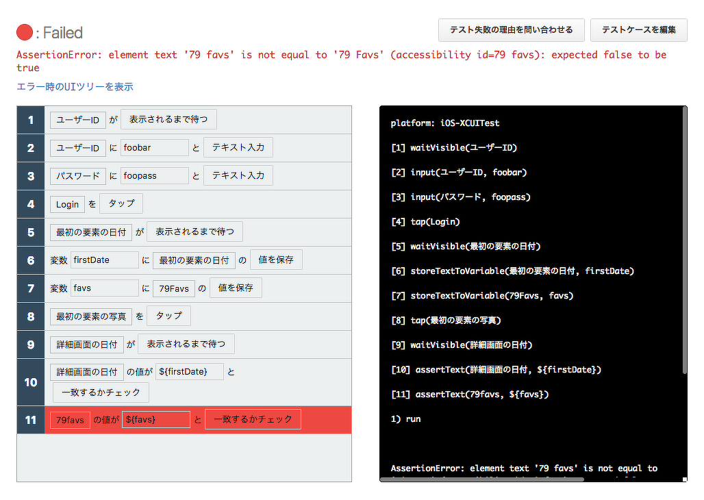 なぜ失敗したか見てみますと、一覧画面の表示は「79 favs」、詳細画面の表示は「79 Favs」と、英字の大小が微妙に統一されていなかったのでした。開発した人は、うっかりしてましたね。アプリ側を修正して、テストを再度実行しましょう。