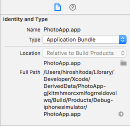 ここで、ビルド済みのAppファイルの絶対パスを指定しましょう。Xcodeでは、プロジェクトナビゲーターの「Products」の中にあるAppファイルを選択すると、ファイルインスペクターの「Full Path」にAppファイルの絶対パスが表示されますので、これを転記してください。