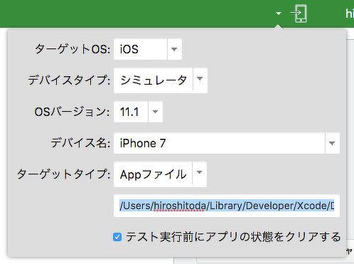 まず、テスト対象を設定します。今回は、iOS 11.1のiPhone 7のシミュレーターを使います。みなさんは、ご自分のお手元の環境に適したものをご設定ください。