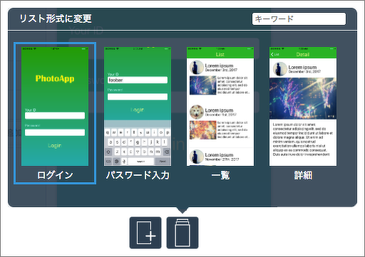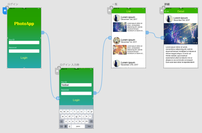 今回のサンプルプロジェクトで想定しているのは、映える写真をインスタントに共有できるiOS向けアプリ「PhotoApp」の開発中の状態です。このアプリは、ログインすると写真の一覧が見られて、写真をタップすると詳細が見られます。既にデバッグビルドは通っていて、シミュレーターで動作確認できるようになっている状態とします。