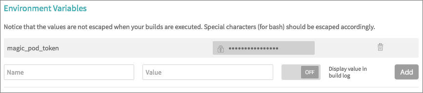 }また、セキュリティトークン `.magic_pod_token` を保存するための環境変数は、CircleCIではプロジェクト設定の「Environment Variables」で設定できます。