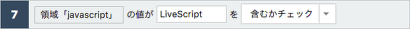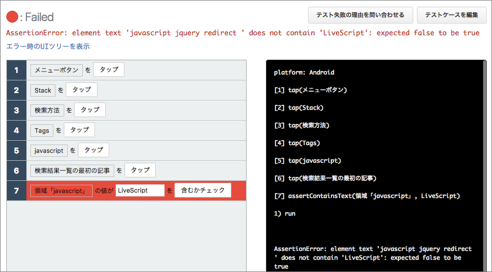 このアサーションが正しく実装できていることを保証するための手続きとして、まずはあえて失敗するように実装してみます。「javascript」の代わりに、古代語である「LiveScript」という文字列が含まれるかを検査するようにしましょうか、必ず失敗するはずです!