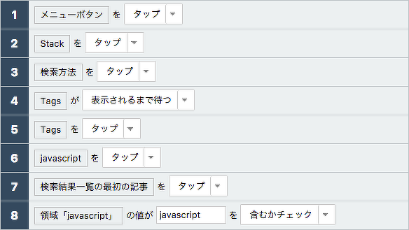 「Tagsをタップ」の前に新しい項目が挿入されましたね! この項目を、「Tagsが表示されるまで待つ」に変更してみましょう。「Tags」が表示されるまではタップせずに待つようになります。