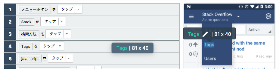 このようなときは、「Tags」の表示を確認するまで明示的に待機する項目を追加して安定させましょう。まず「Tags」を画面からドラッグして、4番目の項目である「Tagsをタップ」の前にドロップします。