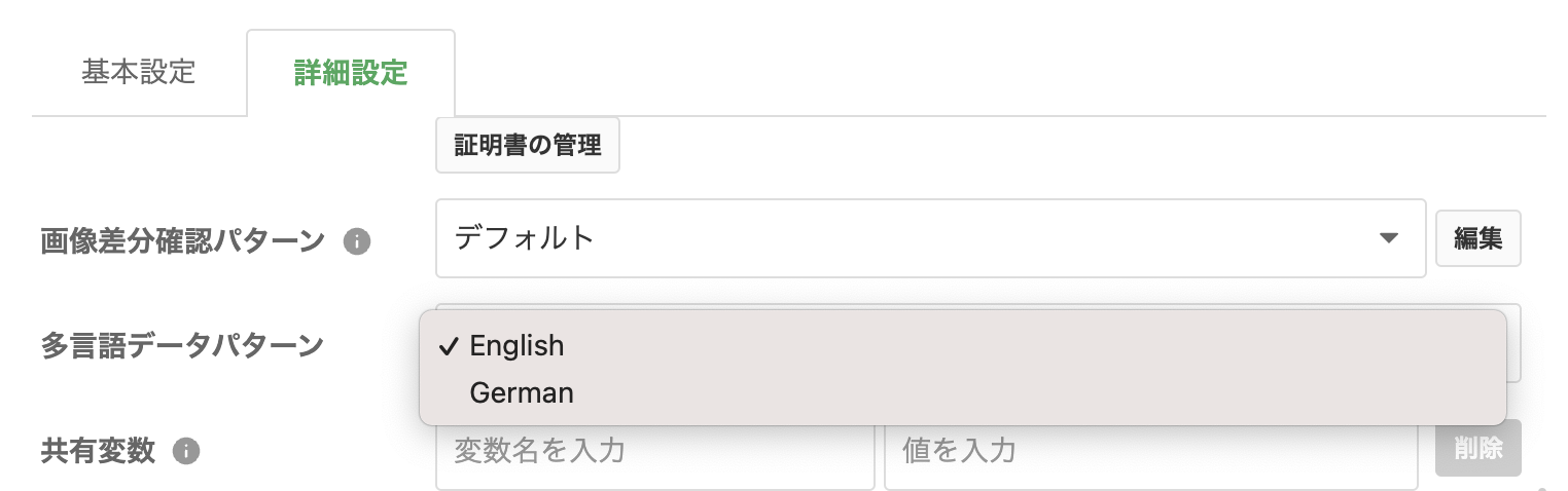 変数を用いるため、各言語毎にテストケースを作成する必要がありません。どの言語で該当のテストを行うかは設定画面から選ぶことができます。(設定次第で全言語ページの同時監視も可能です!)