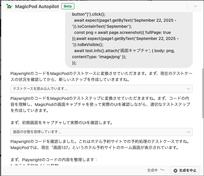 画像のように、Playwrightのソースコードを実際にMagicPodのテストケースに変換してくれました!