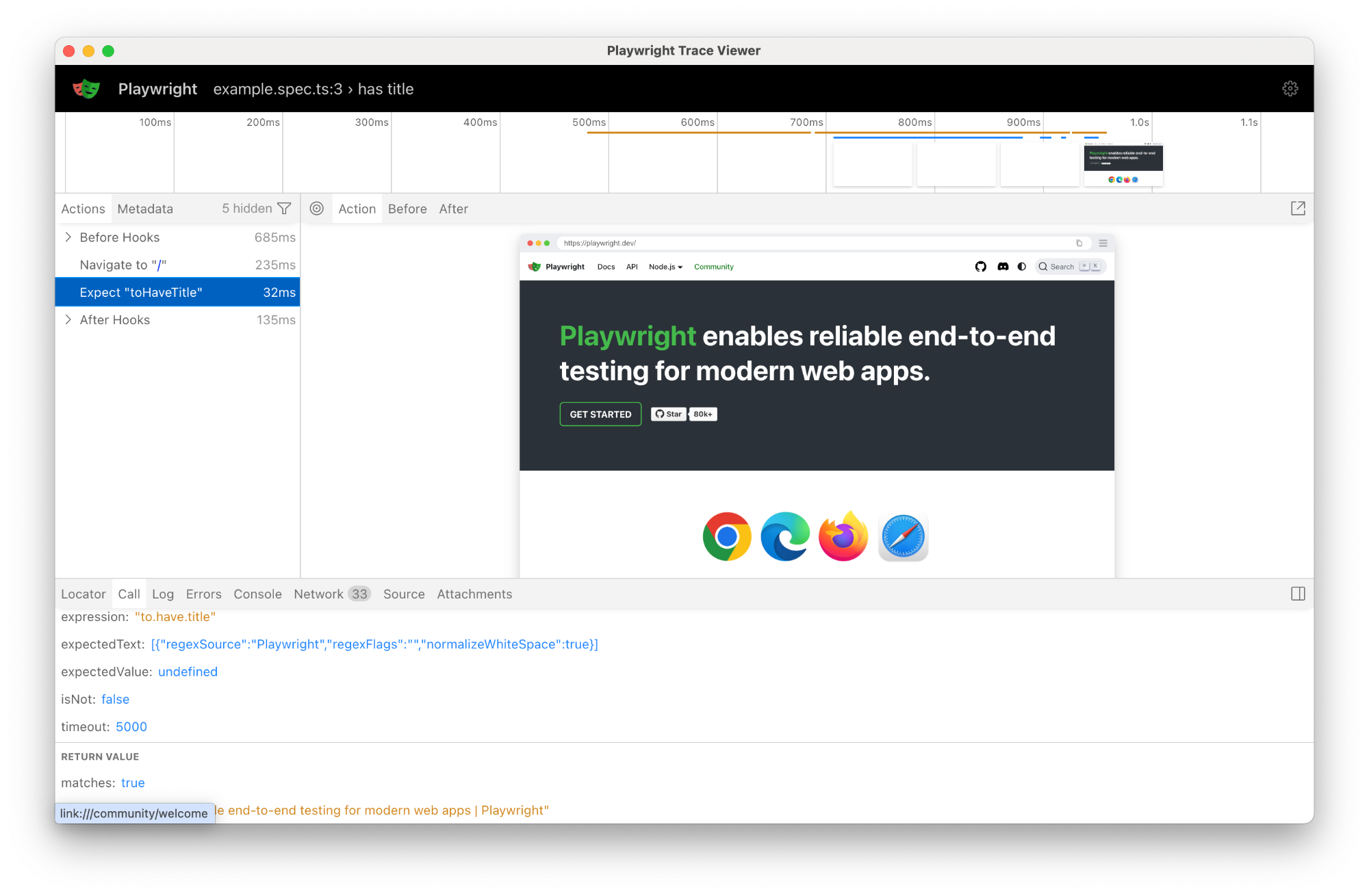 アサーションも自動的にリトライされます。たとえば、toBeVisible()は要素が実際に表示されるまで数秒間リトライし続けます。これにより、動的なコンテンツに対しても安定したテストを書くことができます。