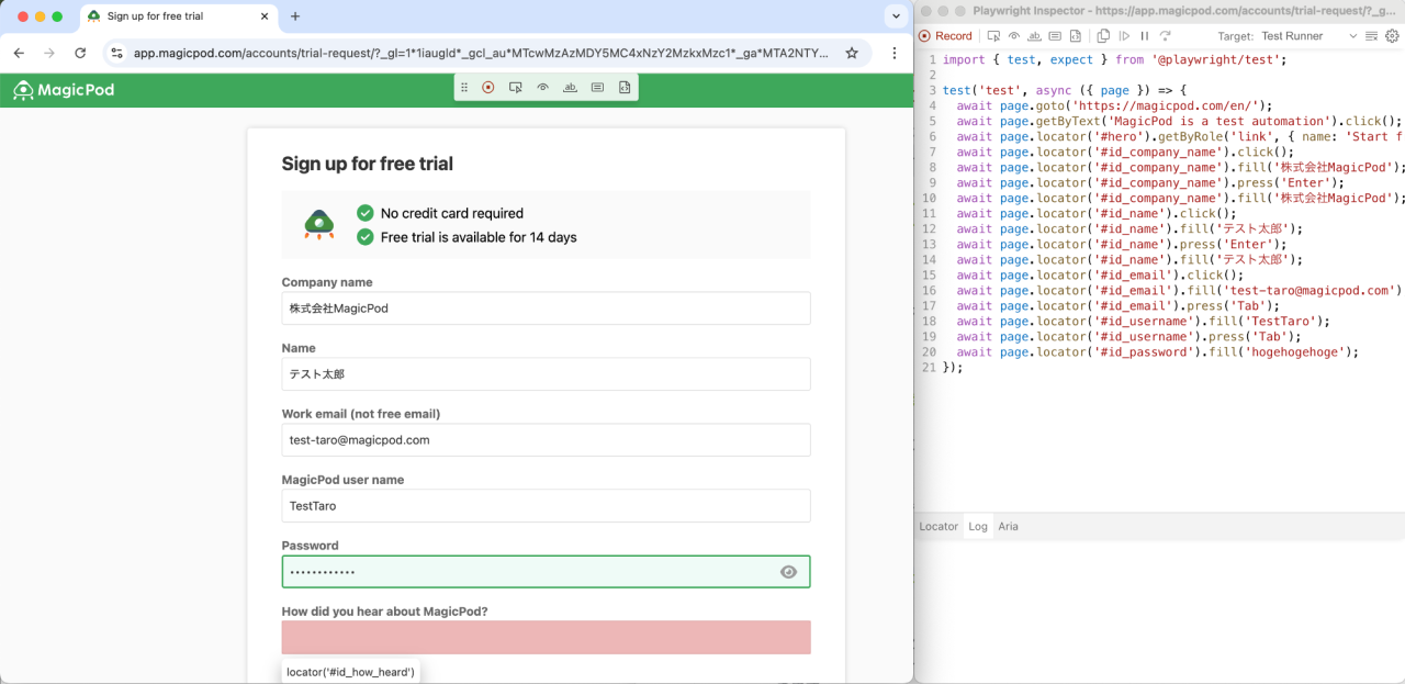ブラウザ上で操作(クリック、入力など)を行うと、その操作に対応するコードがリアルタイムで生成されます。生成されたコードをコピーして、テストファイルに貼り付けることで、テストを作成できます。