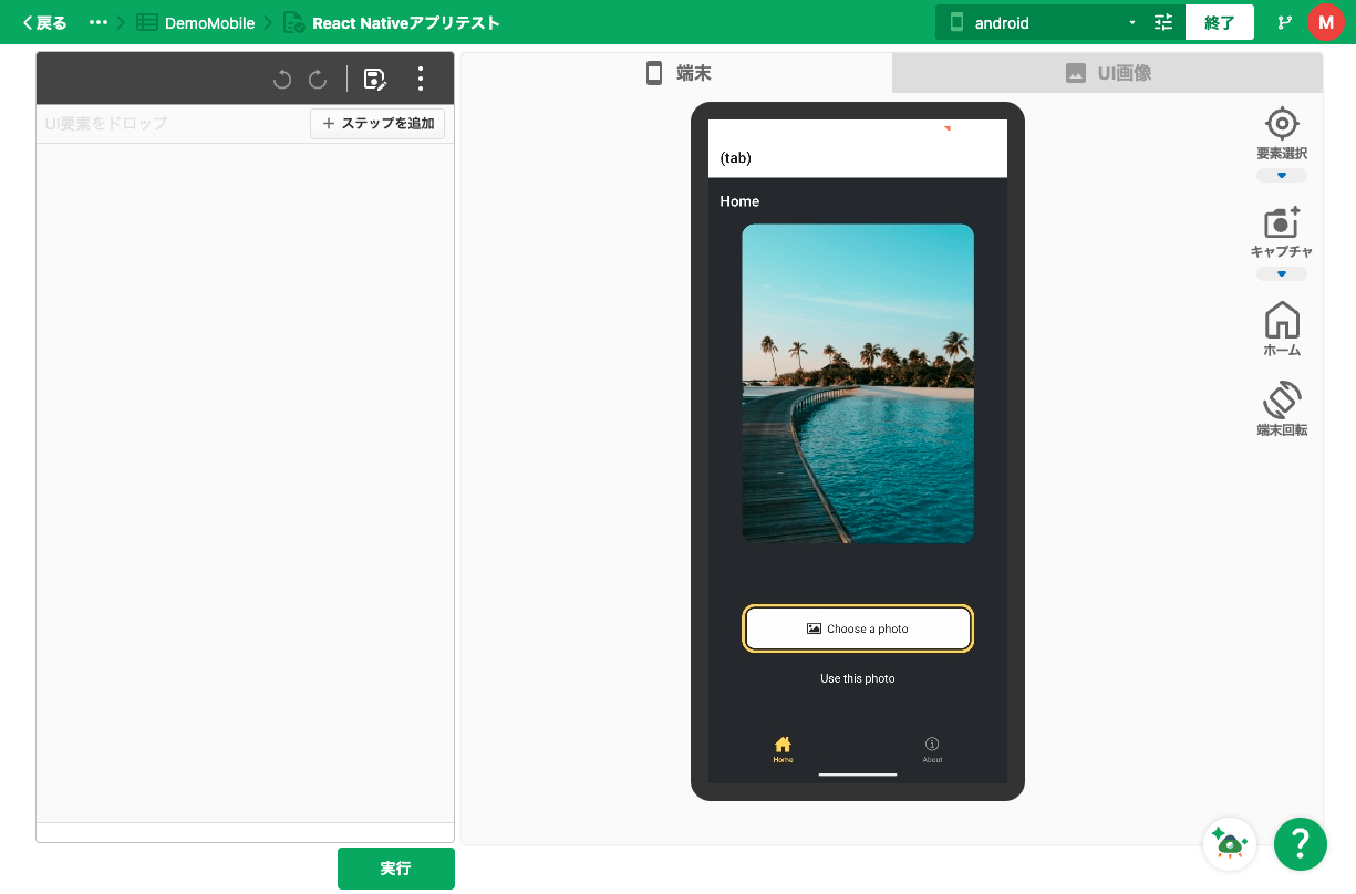 それでは早速テストを作成していきましょう。テスト編集画面では左側にテストステップ、右側にクラウド端末が表示されるような構成になっています。そのため、クラウド端末を操作しつつ、テストステップを作成可能です。