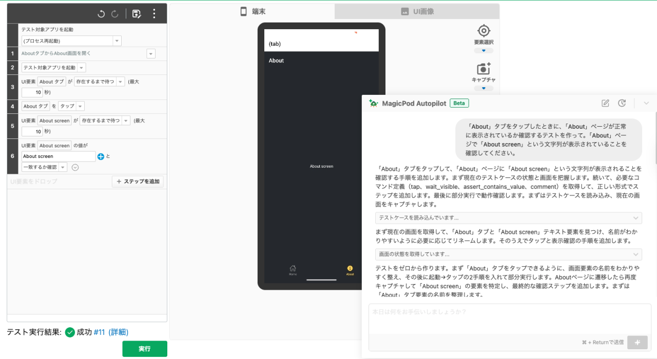 MagicPodではモバイルアプリの自動化に便利な機能を兼ね備えており、React Nativeアプリのテストをノーコードで簡単に作ることができます。また、生成AI機能であるMagicPod Autopilotを使用することで、自然言語でテストを作ることも可能です🚀
