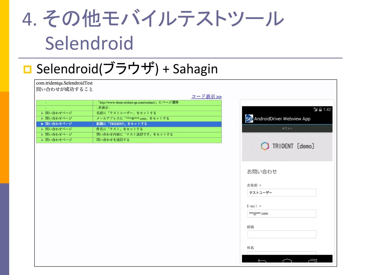 - Androidエミューレータ上のブラウザの画面キャプチャが、ChromeDriverの問題でうまく取得できません※1。「NATIVE_APP」にコンテキストを切り替えれば取得できるので、こちらは次期バージョンで対応予定です。