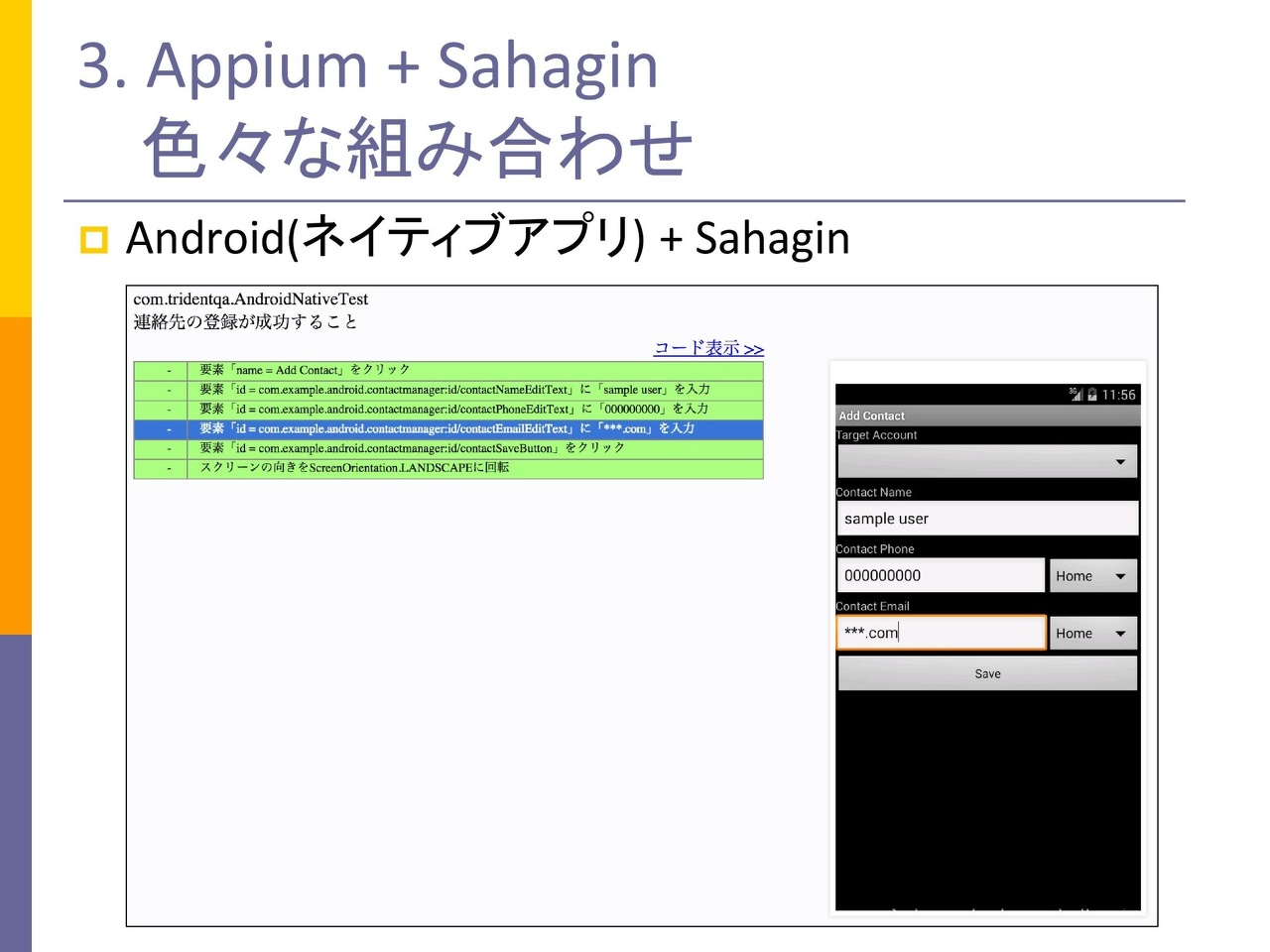 勉強会では、AppiumのテストをJenkinsで実行し、テスト結果をJenkins Sahaginプラグインで確認するデモを行いました。