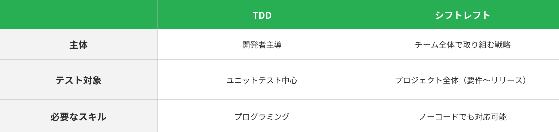 つまり、テスト駆動開発が「開発者向けのアプローチ」であるのに対し、シフトレフトは「チーム全体で取り組む戦略」です。また、テスト駆動開発が「ユニットテスト」に焦点を当てるのに対し、シフトレフトは「プロジェクト全体をスコープ対象」とします。