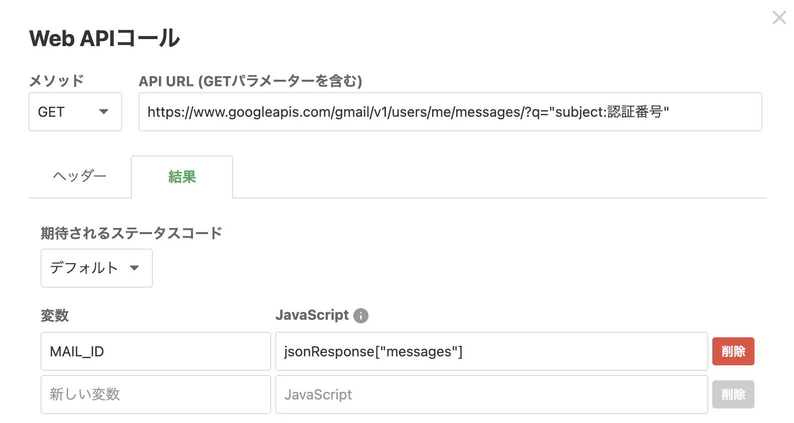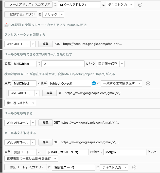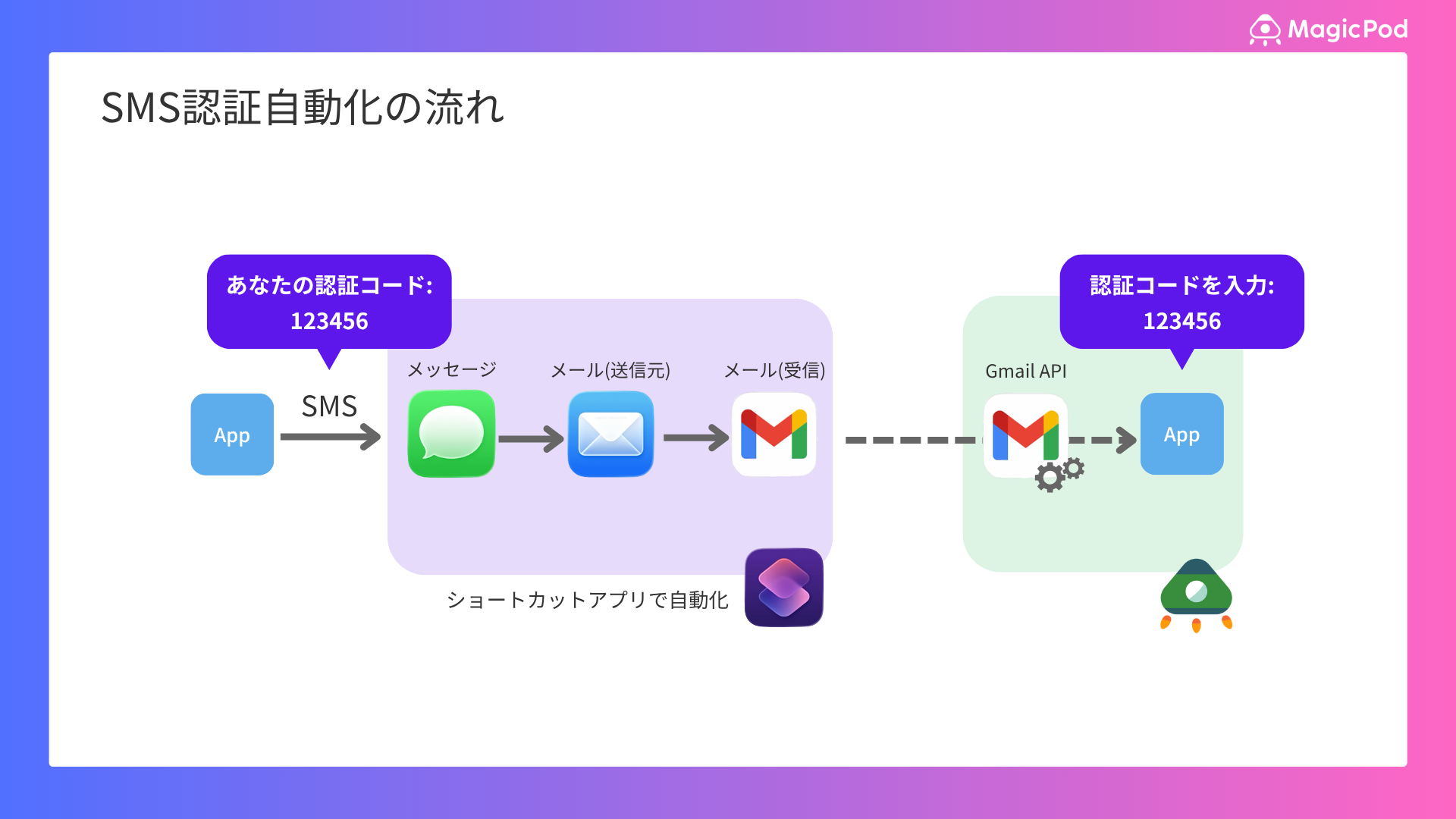 確認コードが書かれたSMSを受け取ったことをショートカットアプリで検知し、メールアプリからGmailに転送。そしてMagicPodのWeb APIコールコマンドでGmail APIをコールし、メール内容を取得します。