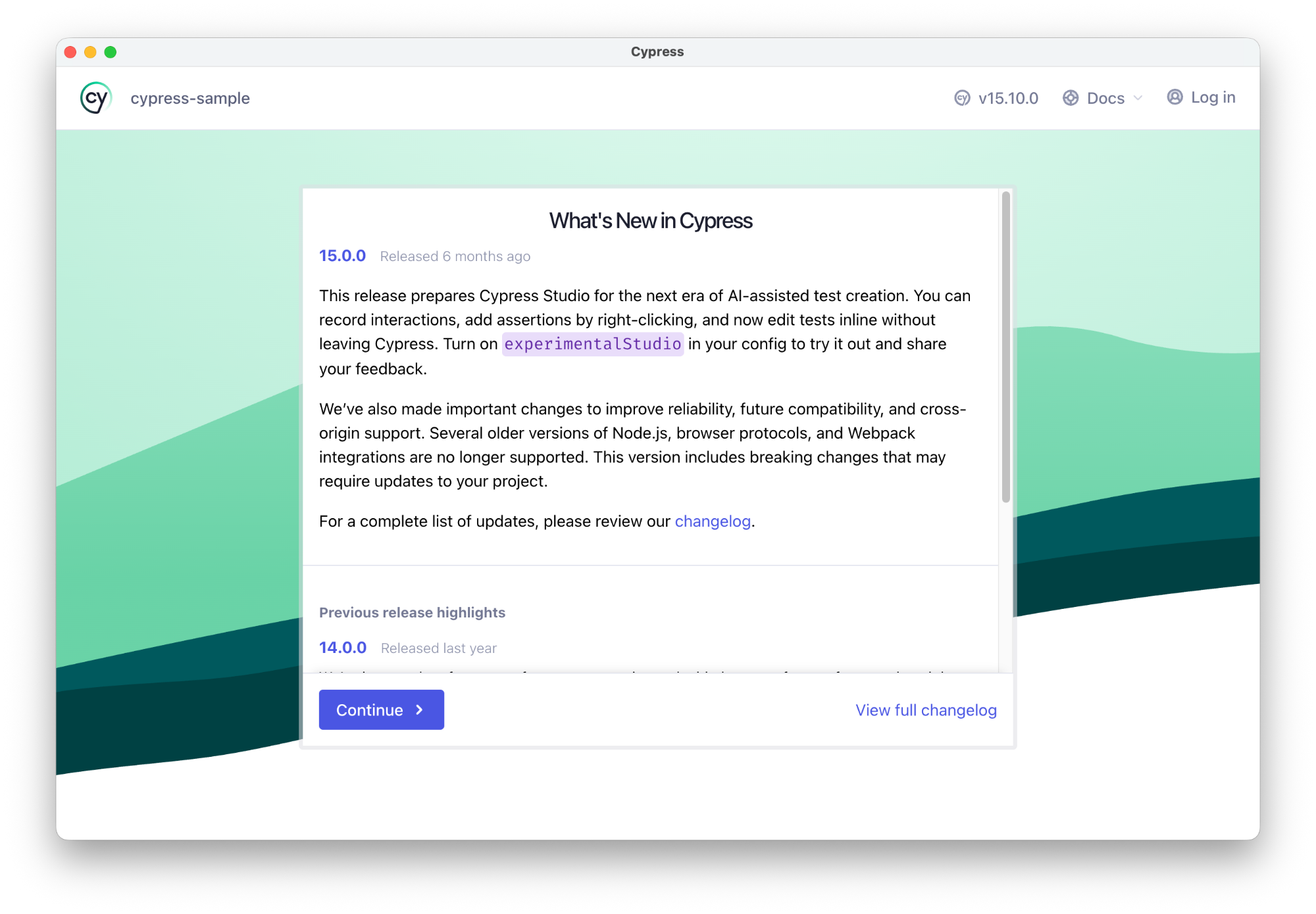 初回起動時は「What's New in Cypress」のリリースノート画面が表示されます。内容を確認したら「Continue」をクリックして進みます。