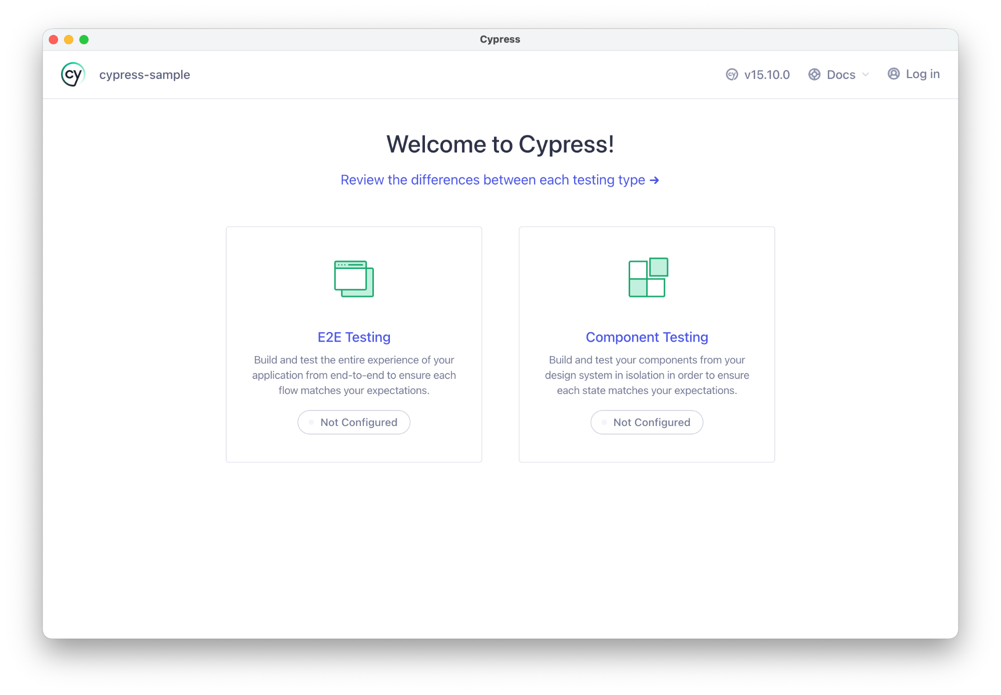 次に「Welcome to Cypress!」画面が表示され、テストの種別を選択します。E2Eテストを行う場合は「E2E Testing」を選択してください。