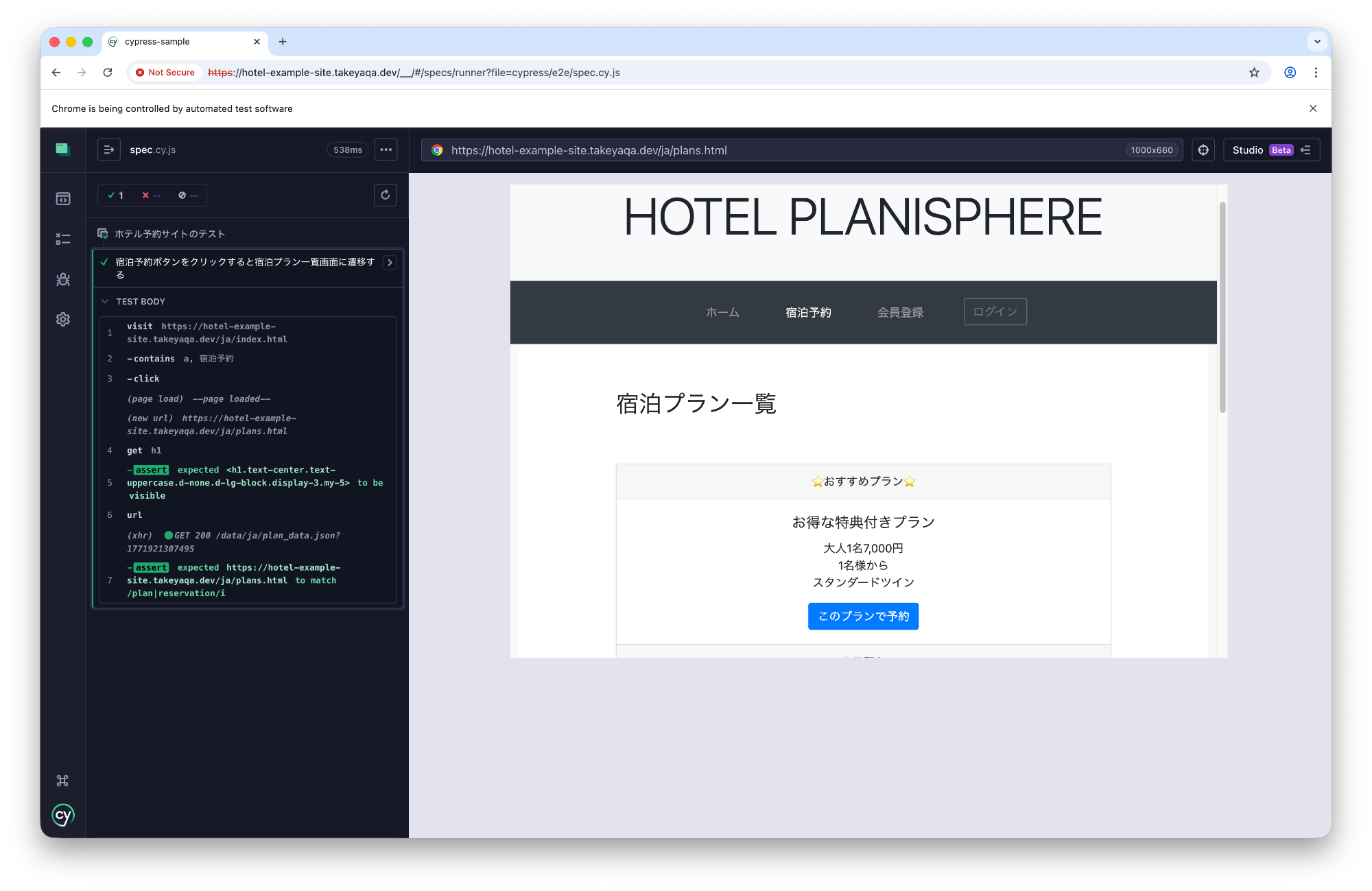 以下は、ホテル予約サイトで「宿泊予約」ボタンをクリックし、宿泊プラン一覧画面に遷移することを確認するサンプルです。