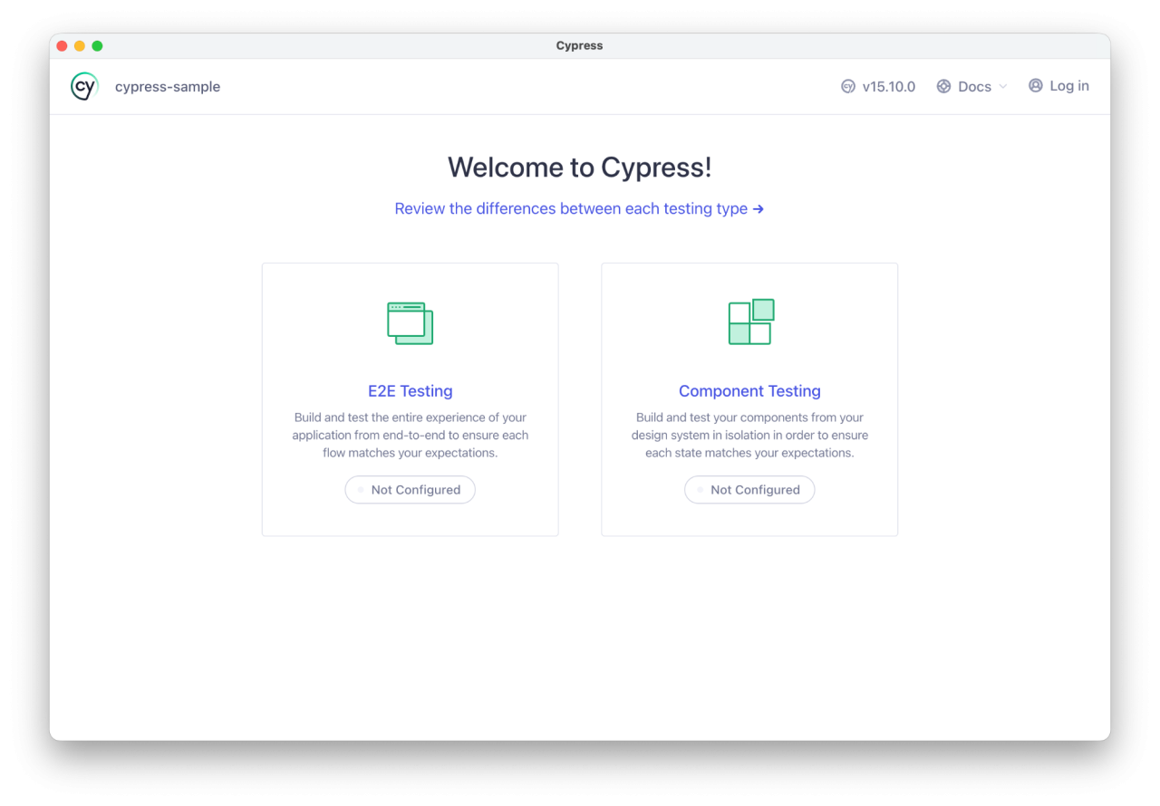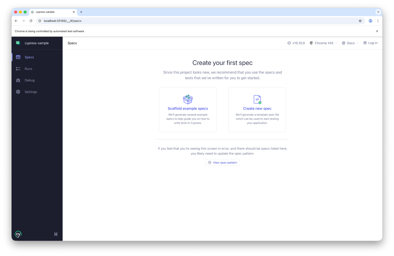 インストール後、以下のコマンドでCypressのGUIランナーを起動します。