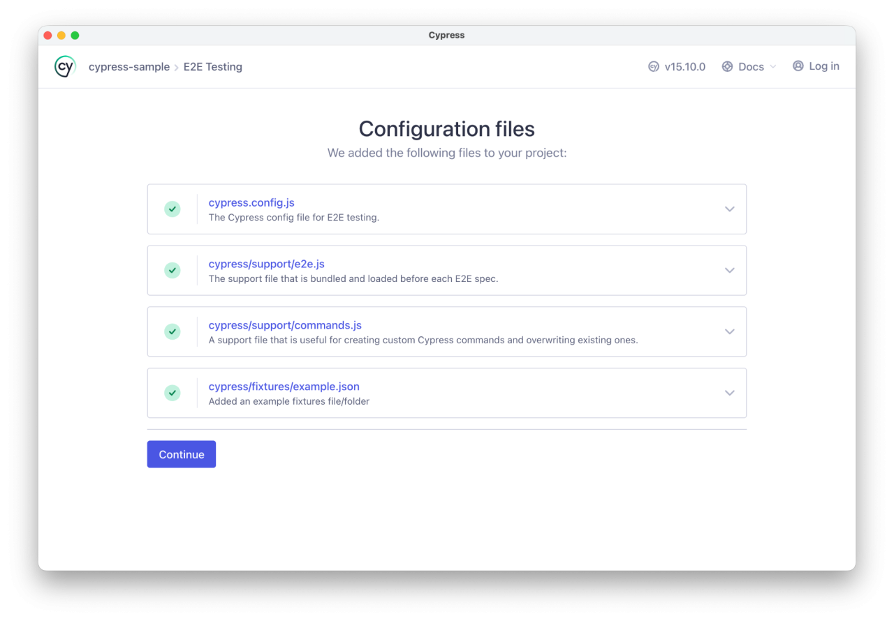 「E2E Testing」を選択すると、Cypressが必要な設定ファイルを自動生成します。生成されるファイルは以下のとおりです。