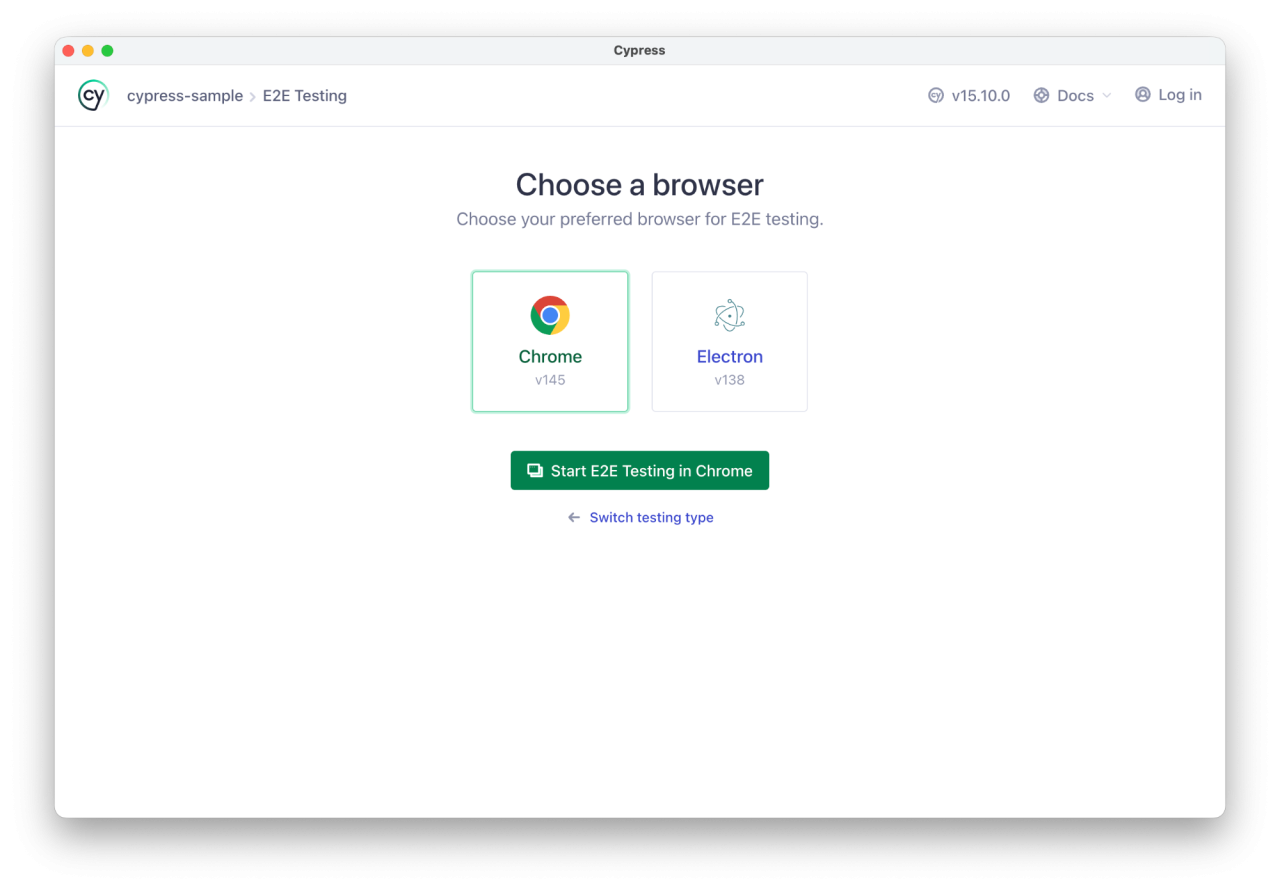 続いてブラウザの選択画面が表示されます。ChromeまたはElectronから選択できます。通常はChromeを選択し、「Start E2E Testing in Chrome」をクリックしてください。