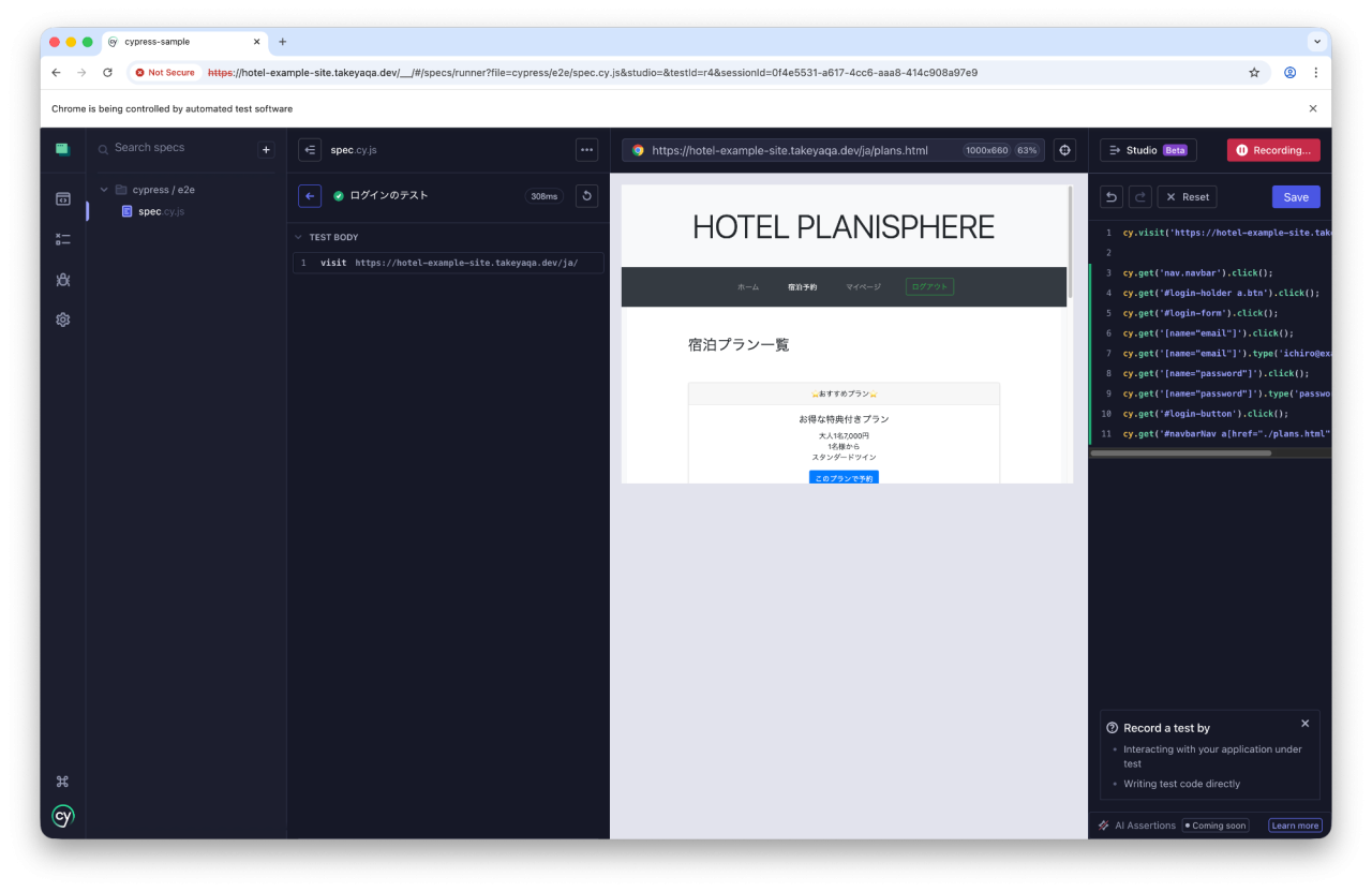 ブラウザが起動し、まずテスト対象のURLを入力する画面が表示されます。テストしたいページのURLを入力すると、そのページが表示された状態で記録モードに入ります。あとはブラウザ上でクリックや入力など実際の操作を行うと、その操作が順番にテストコードとして記録されていきます。操作が完了したら右ペインの「Save」ボタンをクリックすると、記録した内容がspecファイルに書き出されます。