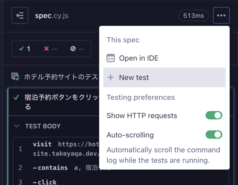 GUIランナーでテストファイルをクリックすると、ブラウザが起動してテストが実行されます。左ペインに各ステップの実行ログがリアルタイムで表示され、右ペインには実際のブラウザ画面が映し出されます。テストがすべてパスすると、ステップ名の左にチェックマークが表示されます。