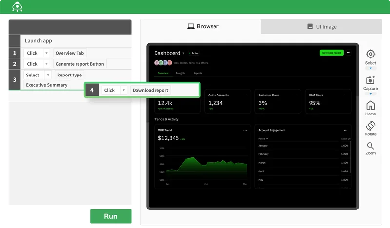 Generate tests from plain English descriptions with Autopilot, and use AI assertions for smarter tests.
