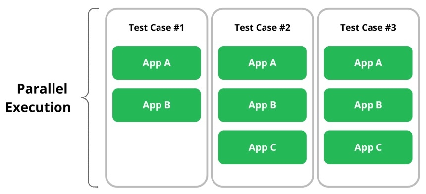 Parallel execution allows multiple test cases to run at the same time on different cloud devices. While this feature is typically used to shorten batch run execution time, this team leveraged it to operate different devices and apps simultaneously, enabling them to function as a single test scenario.