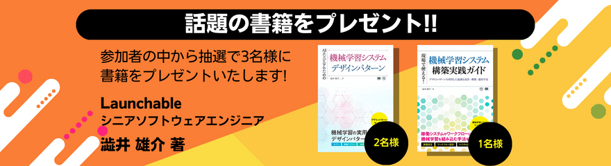 イベントへご参加いただき**アンケートにお答えいただいた方の中で合計3名様に、澁井 雄介さんの著書『機械学習システムデザインパターン』『機械学習システム構築実践ガイド』**をプレゼントいたします!