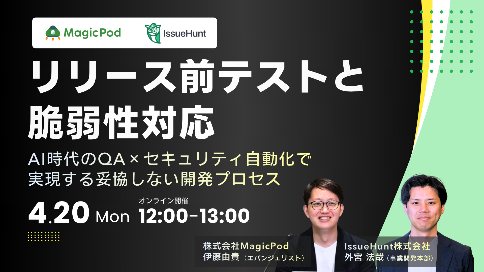 本イベントでは、IssueHunt株式会社と株式会社MagicPod の2社が登壇し、「リリース前のテストと脆弱性対応」をテーマに、QAとセキュリティの両側面からアプローチします。