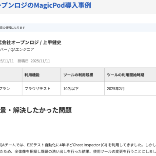 導入の背景・解決したかった問題 導入背景 既にAutifyは他のプロジェクトで利用されていましたが、たまたまQAリーダーがMagicPod社とご縁があり、トライアルを試すことにな...