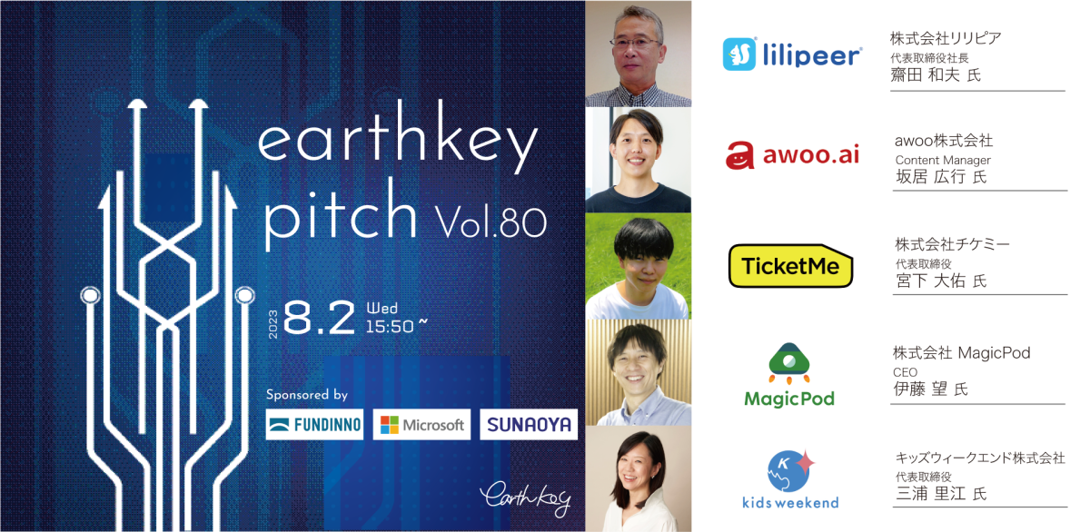CEO伊藤が「earthkey pitch vol.80」に登壇します 2023.07.31 Mon お知らせ CEO伊藤がearthkeyが主催するオープンイノベーションイベント「earthkey pitch vol.80」に登壇します。 「earthkey pitch vol.80」について 【概要】earthkeyが主催するオープンイノベーションイベントです。 業界業種にこだわらず、毎週5社の新進気鋭のシード・アーリーステージのスタートアップ企業が、事業会社との共創や投資家との出会いを目的に登壇します。 【主催】株式会社アースキー 【日程】2023/08/2(水) 15:50 - 17:00