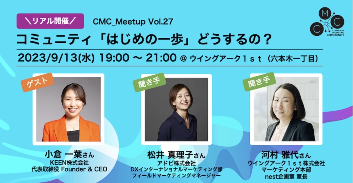 広報 田上が、2023年9月13日(水)に開催される「CMC_Meetup Tokyo Vol.27 コミュニティ/「はじめの一歩」どうするの?」に登壇いたします。