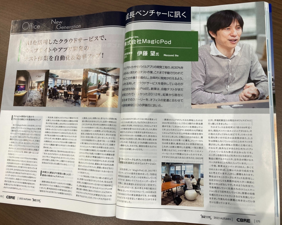 【メディア掲載】雑誌「BZ空間」にCEO伊藤の記事が掲載されました 2023.10.17 Tue メディア掲載 雑誌「BZ空間」にCEO伊藤の記事が掲載されました。 起業から現在に至るまでのストーリーを、オフィスの変遷とともに語っています。 ぜひ、ご覧ください。 ※許諾を頂き、誌面を掲載しております。