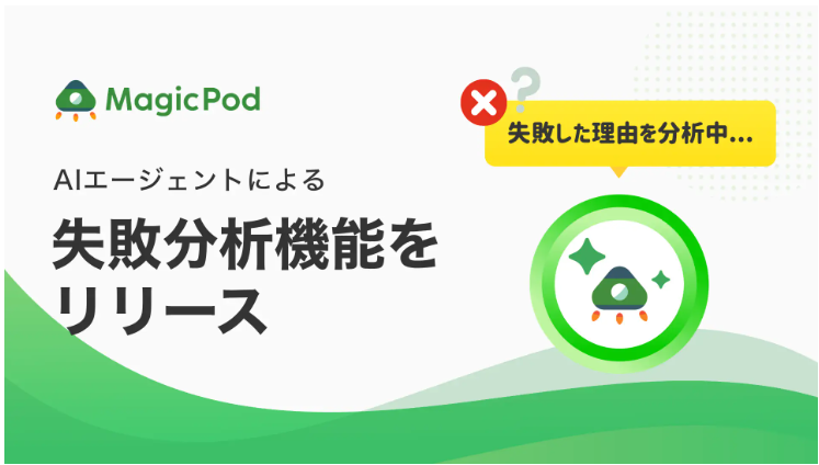 株式会社MagicPod(本社:東京都中央区、代表取締役:伊藤 望)は、AIテスト自動化プラットフォーム「MagicPod」に、AIエージェントがテスト失敗の原因を自動で分析・報告する「失敗分析」機能を2026年4月5日にリリースしたことをお知らせします。