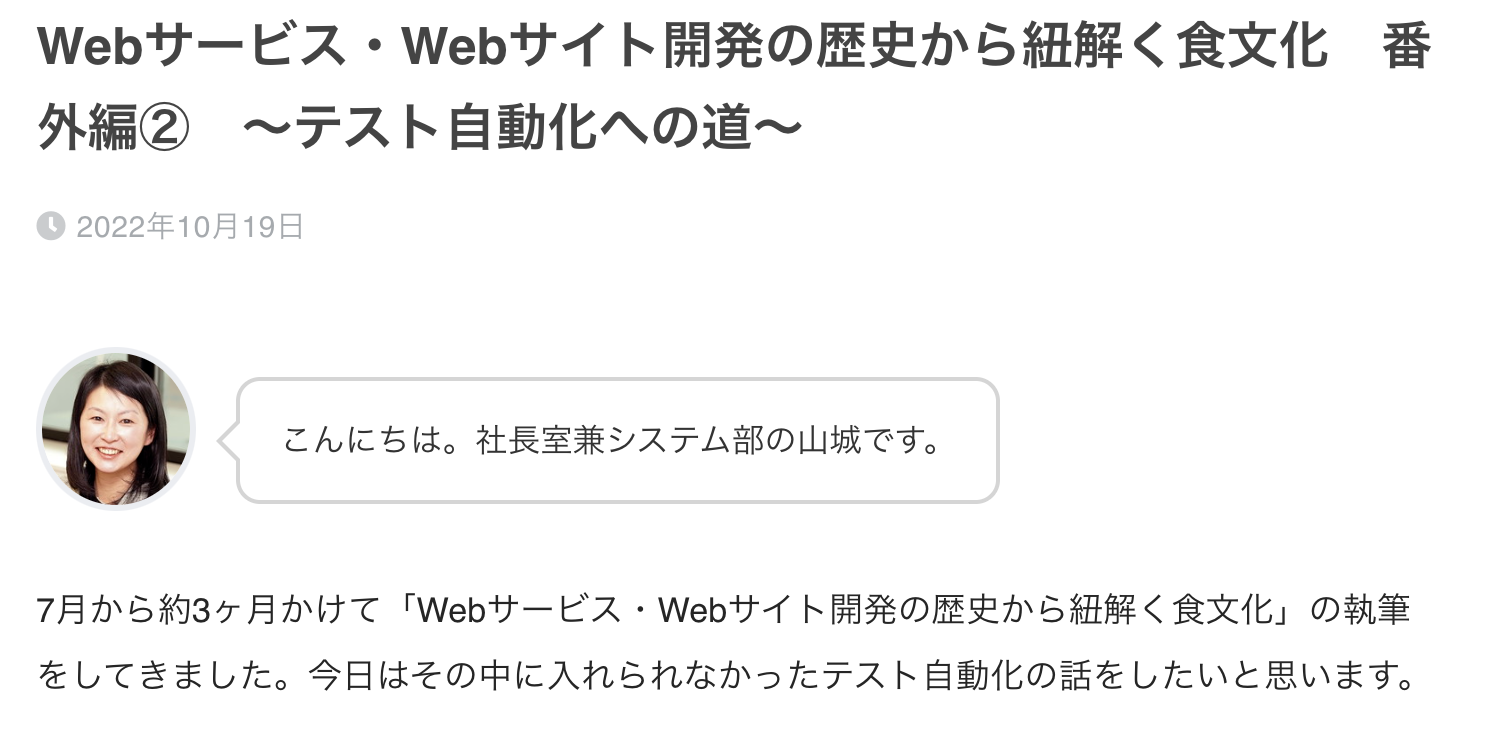 【株式会社食文化様】Webサービス・Webサイト開発の歴史から紐解く食文化 番外編② ~テスト自動化への道~ 7月から約3ヶ月かけて「Webサービス・Webサイト開発の歴史から紐解く食文化」の執筆をしてきました。今日はその中に入れられなかったテスト自動化の話をしたいと思います。