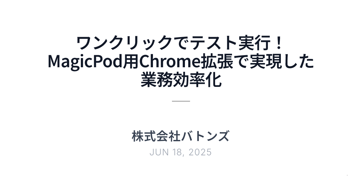 【株式会社バトンズ様】ワンクリックでテスト実行!MagicPod用Chrome拡張で実現した業務効率化 こんにちは。株式会社バトンズでエンジニアをしている鈴木です。バトンズでは日々のテスト自動化にMagicPodを活用しています。本記事では、Chrome拡張の技術的な実装方法の詳細ではなく、MagicPodのAPIを活用することで日々のテスト業務をどのように効率化できるか、その具体的なアイデアと実践例をご紹介します。